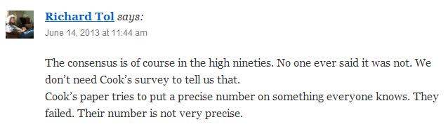 Why do people like Richard Tol  try so hard to dispute a paper whose central conclusion they broadly accept? Why do denialist pundits keep claiming that our consensus paper is flawed when their champion himself admits that we were not so much wrong as merely stating the obvious :