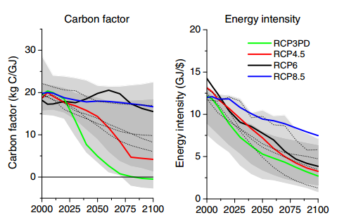 Energy intensity and energy use: the assumption is that the energy intensity of the economy (the amount of energy needed to produce one dollar of output will fall, but modestly compared to projections of recent trends. This is one of the most extreme assumptions of the model and is very different from historical trends (this is hardly “business-as-usual”). This leads to a quadrupling of energy use over this century.
