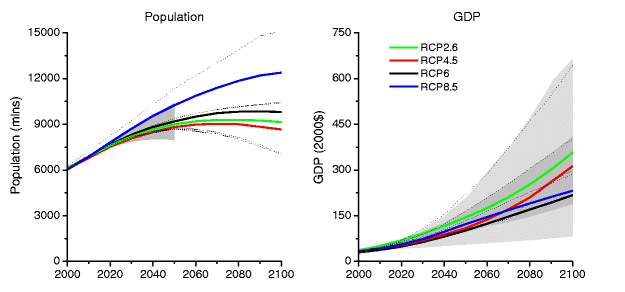 From Van Vuuren et al (2011) as are the following figures. Note that Population and GDP figures are assumptions rather than outcomes of the models. The grey shaded areas are UN population models (left) and assumptions used in AR4 models (right).