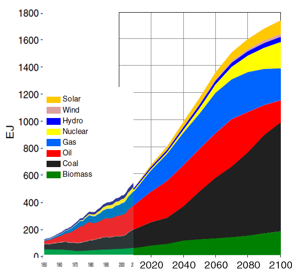 Energy sources. Historical 1950-2008 and projected in RCP8.5 2008-2100. See text for references.
