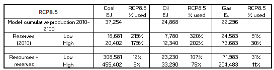 These staggering assumptions for fossil-fuel use naturally raise questions of resource adequacy. In terms of the estimates of reserves of fossil fuels, the RCP8.5 model uses (roughly, by my own calculations using the figures given in Table SPM-3 of the GEA report) twice the current coal reserves, two to three times the oil reserves and half of the gas reserves. This is not quite as unreasonable as it seems because resources are constantly converted to reserves through development. In terms of reserves + resources, the RCP model uses, by 2100, about 10% of the current coal resources, nearly all of the oil resources and around one-quarter of the gas resources. It should go without saying that this exploitation will involve aggressive development of the world’s unconventional and low-grade resources and it will have huge financial and environmental costs.