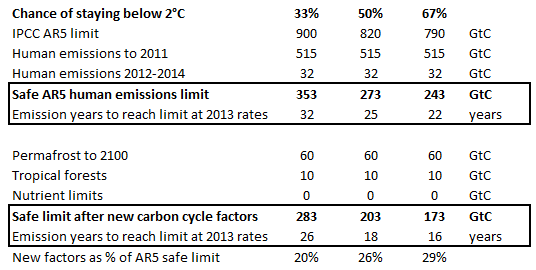 Using those numbers, updating them with actual emissions from 2012-2014 and subtracting the carbon cycle feedbacks gives this table: