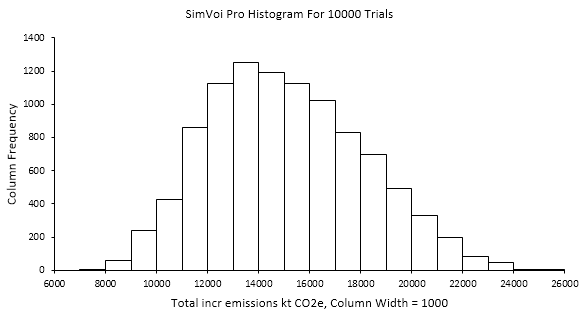 The results produce a median value of 15.1 Mt CO2e and a P5-P95 range of 10.5 to 20.5 Mt CO2e. My deterministic 14 Mt CO2e estimate is near the modal value of the probabilistic range. I made several assumptions about the distribution of the various uncertain input parameters and I can detail these in another post if there is interest from readers. The input factor that produces most of the variance is the methane leakage, for which I assumed a triangular distribution of zero to 2.7%, with a most likely value at 0.8%.