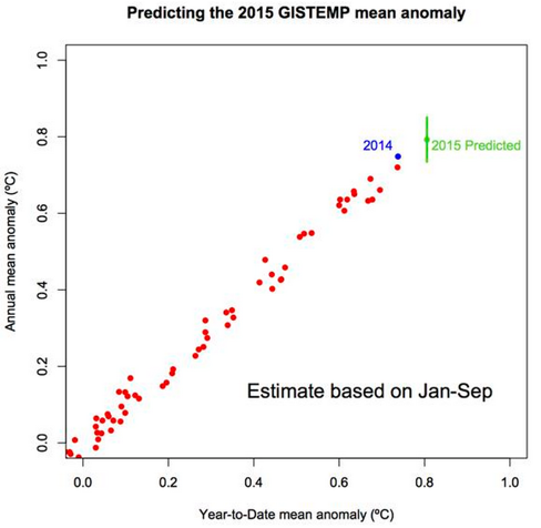 Gavin Schmidt tweeted this graph, which cross-plots the year-to-date mean anomaly against the final annual anomaly. He estimates that there’s a 93% chance of 2015 being the warmest year. That’s fairly consistent with my (eyeballed) comment on Sou’s graph where it would take an exceptional one-in-twenty end-of-year anomaly fall (1998 is the only one among the years 1995-2014 that fits the bill) to put 2015 under 2014. Gavin’s analysis is purely statistical and is not informed by the fact of the current strong El Niño, so his 93% estimate of a record is conservative. His prediction (sans future El Niño effects) for 2015 is (roughly) 0.80 degrees, which is also what you get if you simply extrapolate Sou’s 2015 line based on the last three months’ year-to-date averages. My guess is 0.825 degrees.