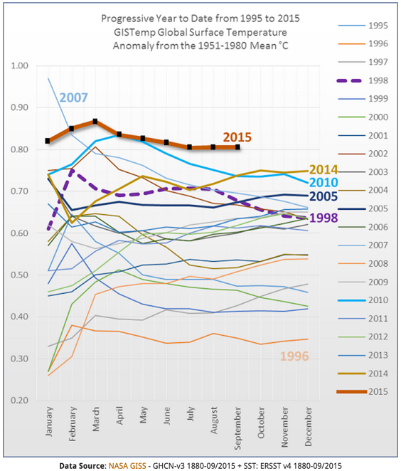 This is Sou’s latest graph showing year-to-date averages. Note how the early-year averages are more variable than the averages toward the end of the year. Of course, this is a function of reducing noise by averaging over an increasing number of months. 2015 is streets ahead of the rest and we would need a 1998-style end-of-year collapse for 2015 to end up below 2014.