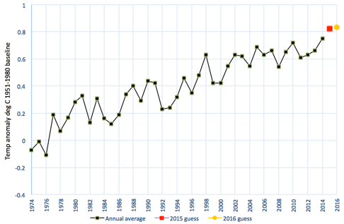 According to my smudged and cracked crystal ball, 2016 will be a little hotter still at 0.833 degrees C, setting a rare three-year run of records. But that is obviously highly speculative and uncertain. Anything, apart from me being right for my expert insight, could happen.