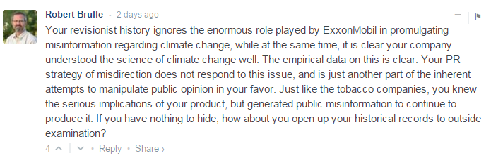 There have additionally been a couple of blog responses from Ken Cohen, the company’s VP of public and government affairs, here and here that boast of Exxon’s commitment to climate science, the 50 peer-reviewed publications they have made (a listing of them would be helpful), and all of the great work the company is doing on biofuels and CCS. There is no mention at all of the PR and lobbying strategy that was at odds with what their experts really knew. As Robert Brulle responded in the comments: