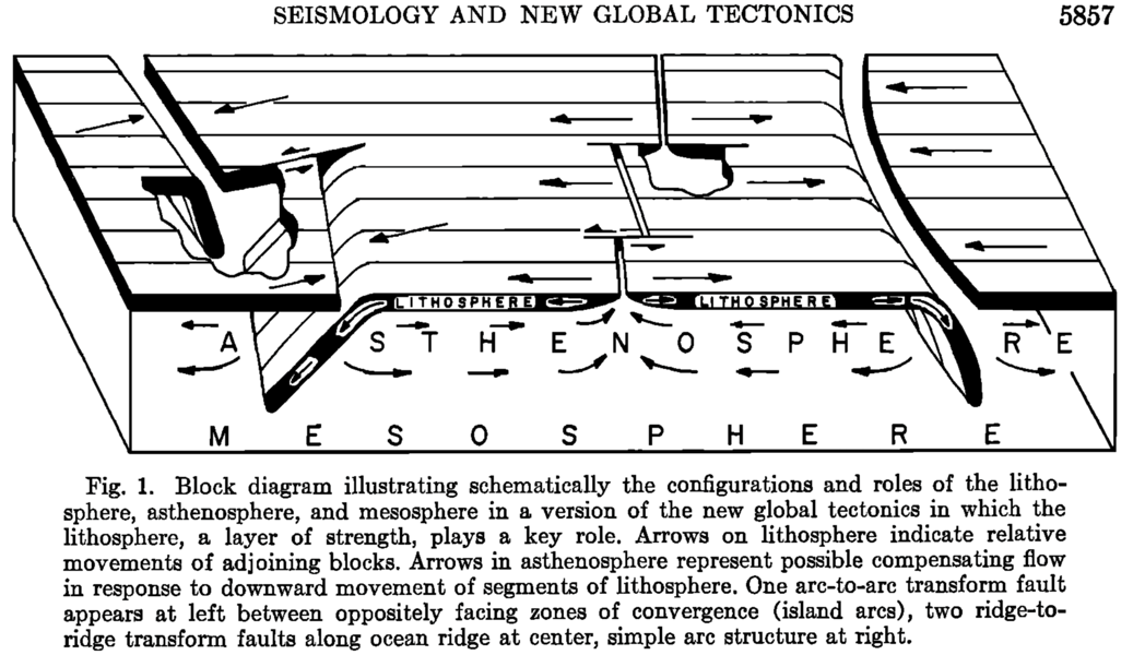 7. A detail: I’m glad you mentioned that what we now call plate tectonics had been accepted, at least as possibility, in Europe, for some decades before the “revolution”. The diagram you show is in fact remarkably similar to the one that Arthur Holmes had generated in 1931: http://www.mantleplumes.org/WebDocuments/Holmes1931.pdf p. 579. The idea of convection as a way (and some would still argue, the best way) of escaping from Kelvin’s cooling argument is even older: https://paulbraterman.wordpress.com/2014/03/03/the-deep-roots-of-intelligent-design-creationism-pt-ii-of-kelvin-rutherford-and-the-age-of-the-earth/
