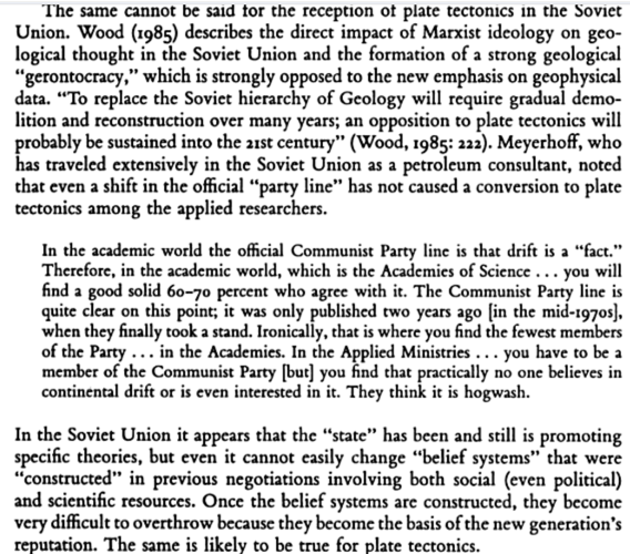There was evidently a stronger gerontocracy in the Soviet Union than there was at the University of Sheffield. However, both Muir Wood and Stewart were writing in the 1980s and didn’t see the Soviet Union collapse coming. Their prediction that opposition to plate tectonics would be sustained into the 21st century didn’t happen for the most part.