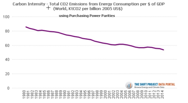 Feedbacks aside, Anderson argues that to meet the 650 Gt CO2 target, annual reductions in emissions of 10% would be required. If you assume 3% in annual GDP growth, that would imply a 13% year-on-year reduction in carbon intensity per unit of GDP.