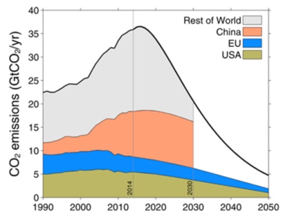 From Peters et al. (2015) showing the projected emissions from the USA, EU and China based on the Intended Nationally Determined Contributions (INDCs) that will be presented at the December 2015 meeting in Paris. The black line is a pathway consistent with 2°C.