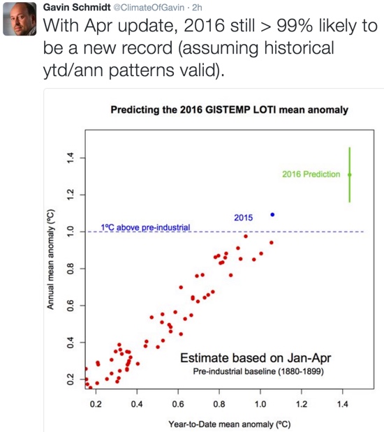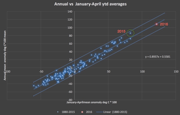 Very interesting analysis of GISS LOTI data. It is shocking just how far outside the range of historical data the 2016 data point appears on the plot of January to April temperature anomalies.
