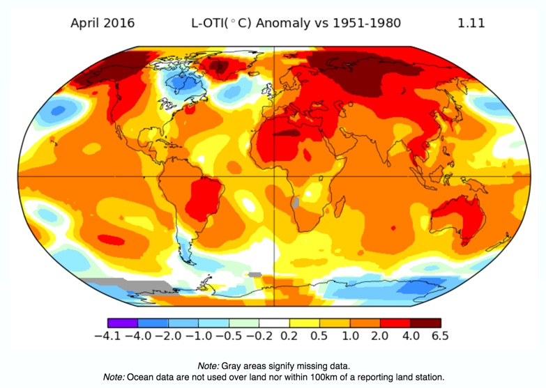 The GISTEMP global temperature anomalies are now out for April 2016.