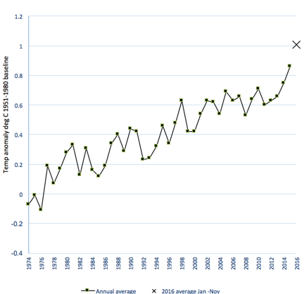 The Met Office has a press release just out. A year ago, they predicted an anomaly of 0.84°C (±0.12) for 2016. For this year, January-October inclusive, they have observed 0.86°C (±0.10), so their prediction was very close.  They say that 0.20°C of the 2016 average anomaly was caused by the El Niño that happened in the early months of the year.