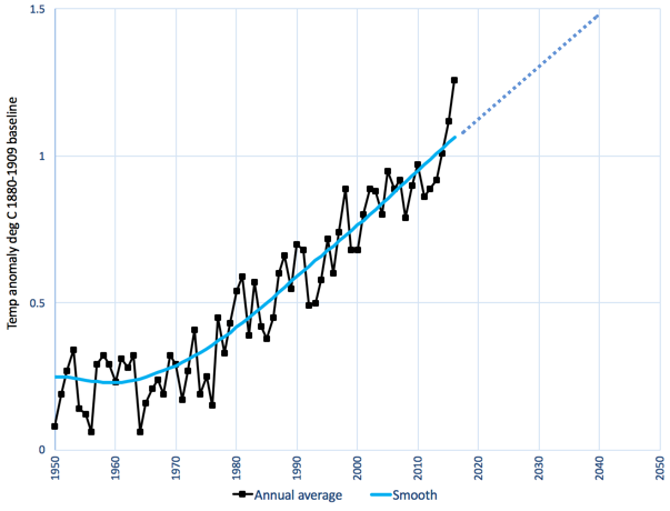 The trend is now above the 1.0°C anomaly level relative to pre-industrial temperatures. The smoothed line shows remarkable linearity since 1980. Simply extending this trend to 2050, as shown by the dotted line, suggests that the 1.5°C threshold will be reached in about 25 years. We are now already halfway to  2.0°C and two-thirds of the way to  1.5°C.