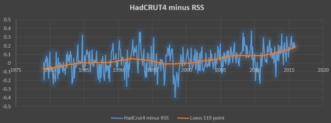 Zeke Hausfather at Carbon Brief has written an account of a new paper by Carl Mears and Frank Wentz of RSS systems, a group that analyzes atmospheric temperatures measured by satellites. In January 2016, I made a few observations (scroll down to the sub-heading “Up in the Air”) about recent departures between RSSv3 lower troposphere measurements taken by satellites and the HadCrut surface temperature record. It seemed that there was a growing divergence of about 0.2 degrees in recent years. At the time it was not clear if this was due to measurement error or some unknown physical process.